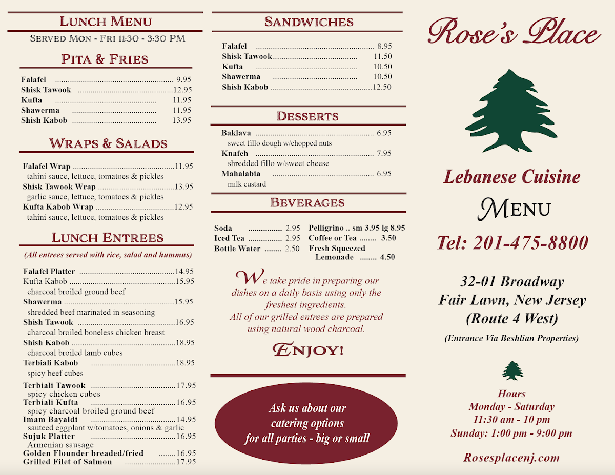 Welcome to Rose's Place: Lebanese Cuisine, where culinary artistry meets authentic Lebanese flavors in Fair Lawn, NJ. The menu is a vibrant tapestry of traditional cold appetizers, salads, and desserts that promise to take your taste buds on an unforgettable journey.